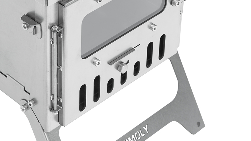 POMOLYの窓付きストーブは厚さ1ミリのTA 1/GR 1チタンから製造されています。軽くて、わずか2.1kgだけです。チタンストーブは他の材料に比べて熱伝導率が高い。ホットテントや野外で炊事する熱源に最適です。